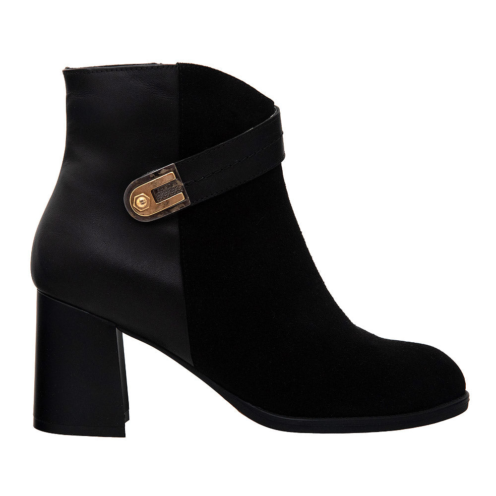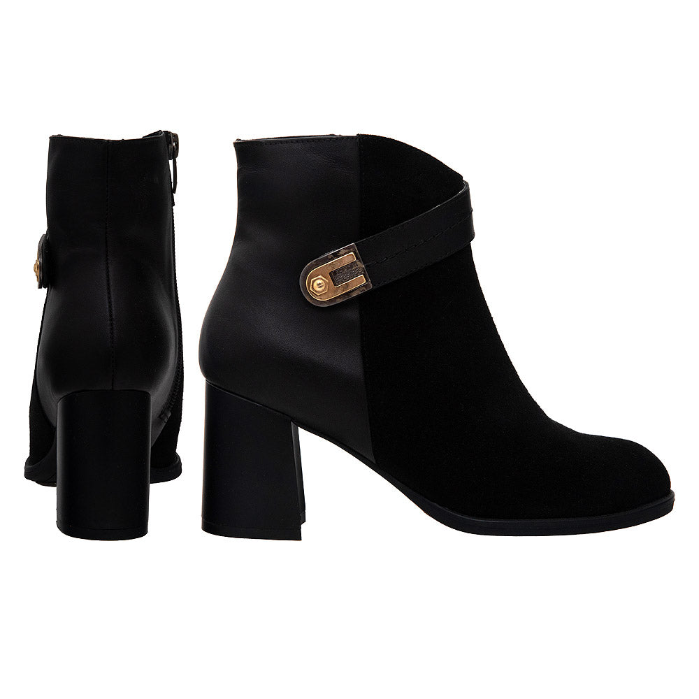 Botine din velur negru cu toc gros, completate de un panou posterior din piele. Căptușeala textilă matlasată, brantul moale și fermoarul lateral asigură confort și încălțare rapidă, iar pielea premium, interior și exterior, se mulează plăcut pe picior.