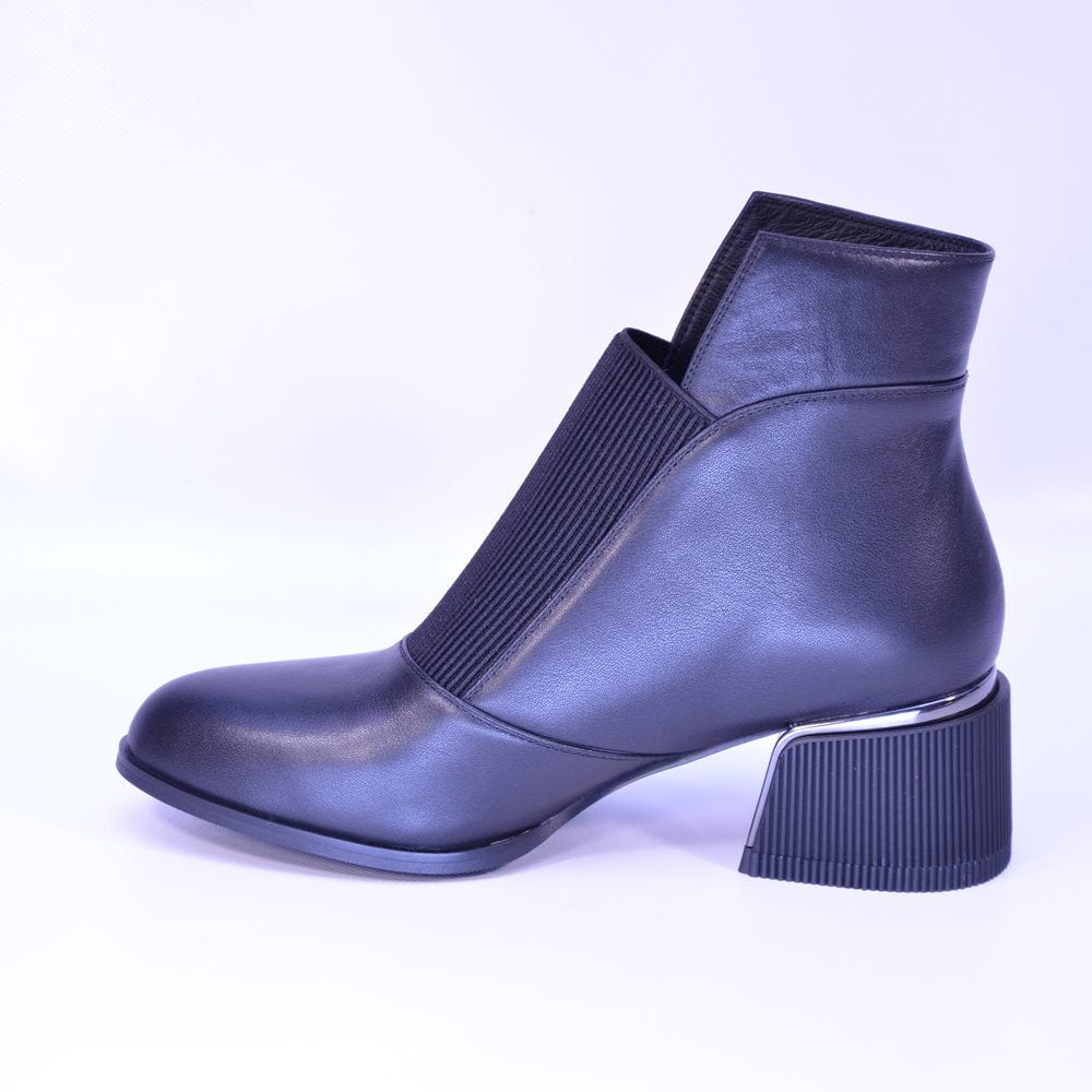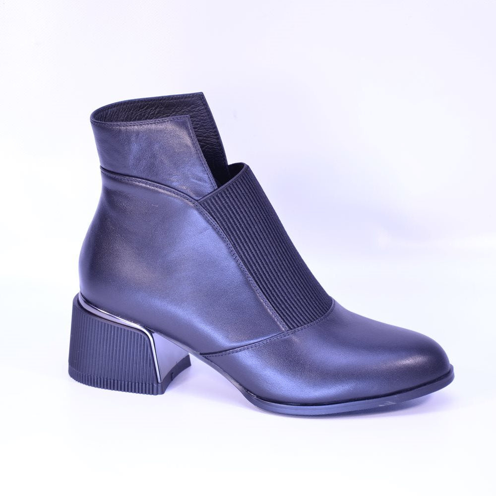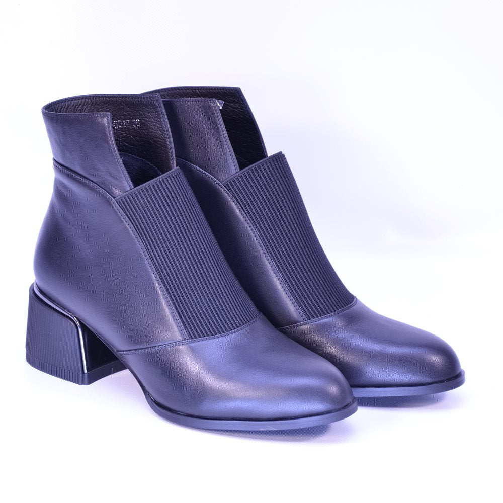Botine negre din piele naturală moale. Interiorul matlasat și designul slip-on cu elastic asigură încălțare rapidă și confort termic, iar brățara decorativă cu strasuri adaugă o notă rafinată.