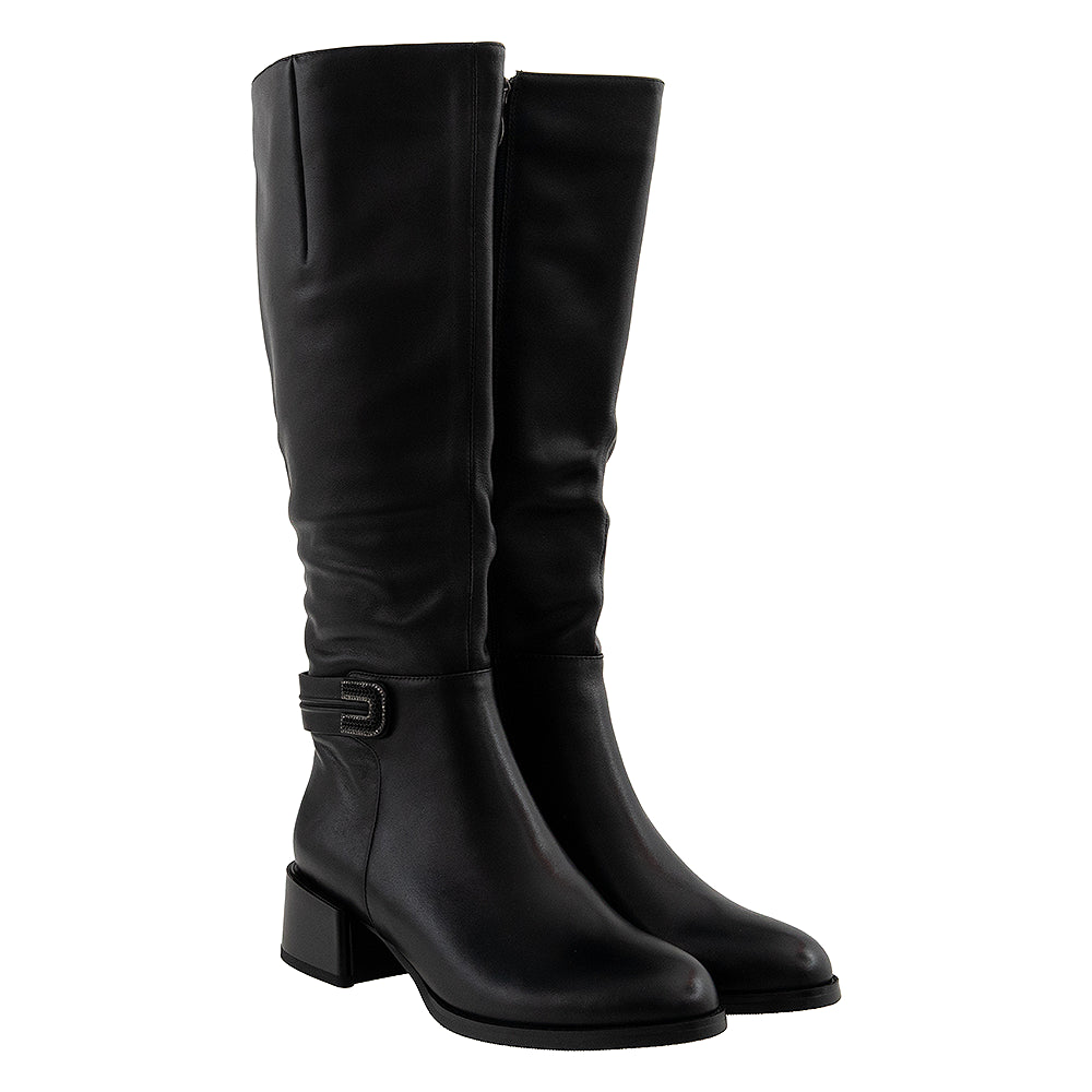 Cizmele lungi din piele naturală se remarcă printr-un design elegant și funcțional, ideal pentru sezonul rece. Cu un toc gros de 4 cm, talpă antiderapantă și interior căptușit cu material textil, acestea oferă confort și stabilitate pe tot parcursul zilei. Detaliul decorativ sub formă de curea cu cataramă încrustată cu strasuri adaugă un plus de stil și originalitate.