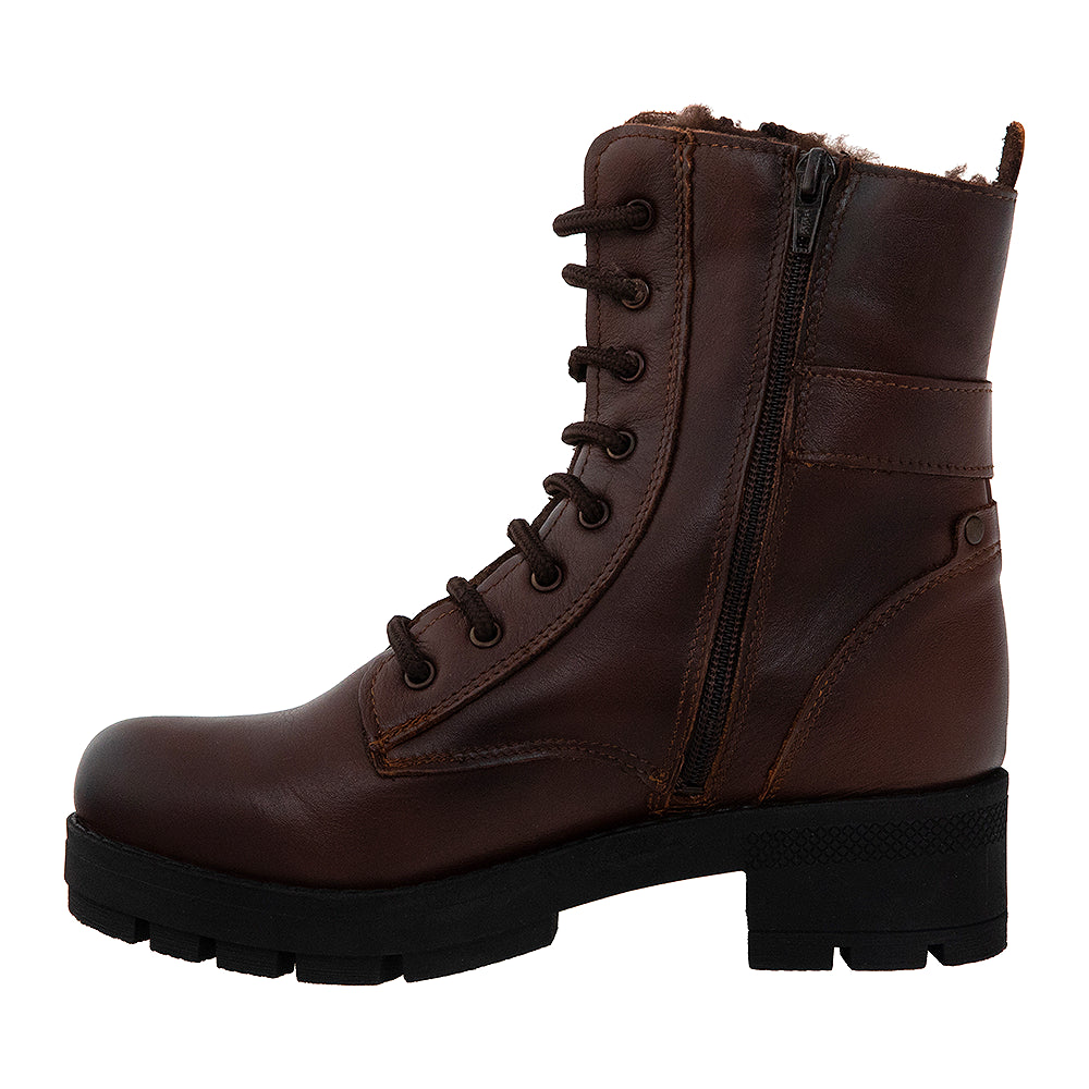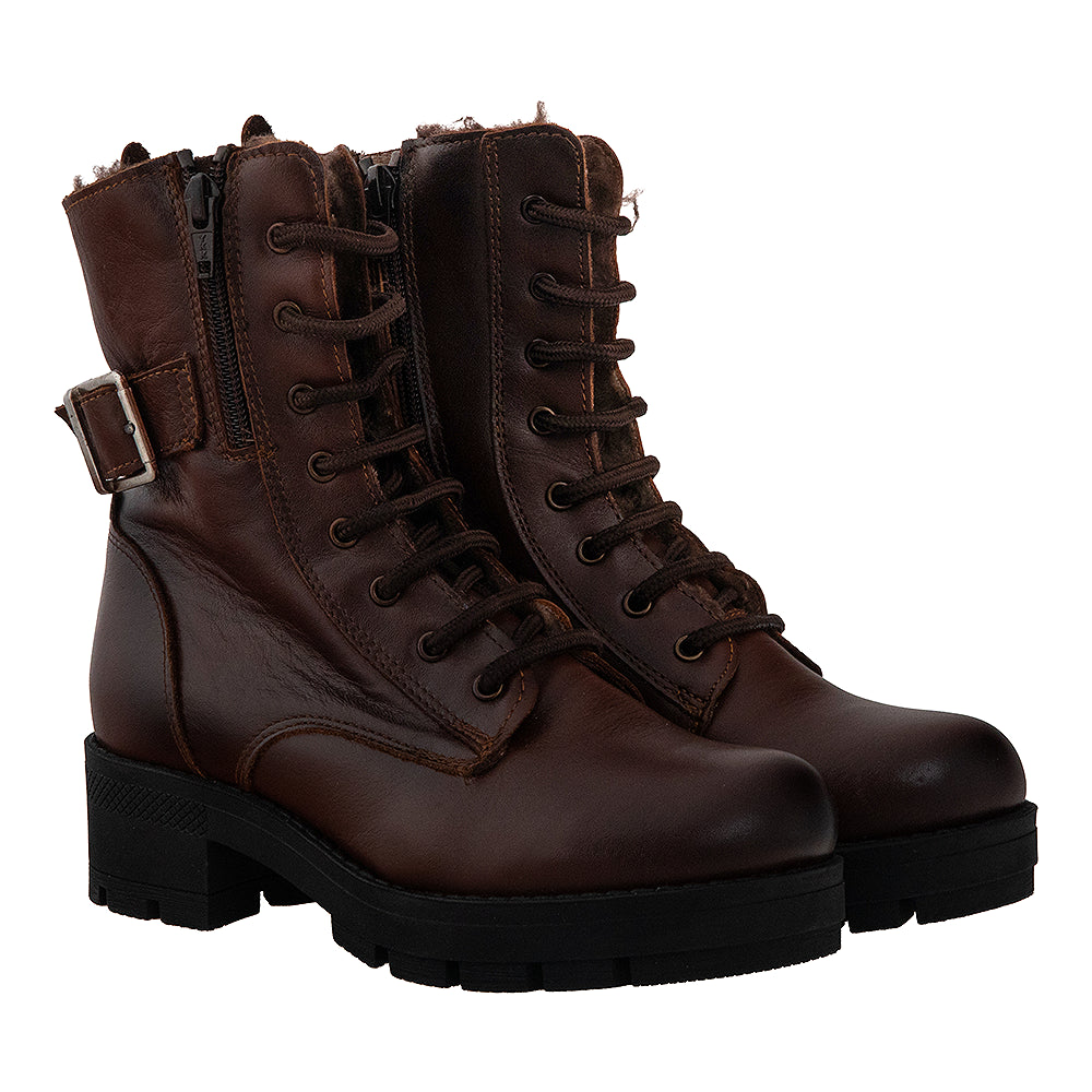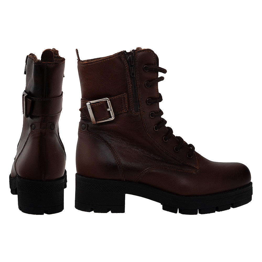 Ghete din piele naturală, fabricate în România. Căptușeala din blană sintetică păstrează piciorul cald, iar talpa groasă, de 2,5 cm, oferă aderență excelentă pe timp rece. Tocul de 4,5 cm. Sistemul cu șiret și fermoar lateral asigură încălțare rapidă, iar catarama metalică completează designul robust.