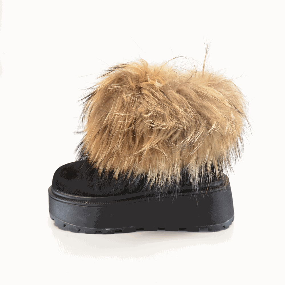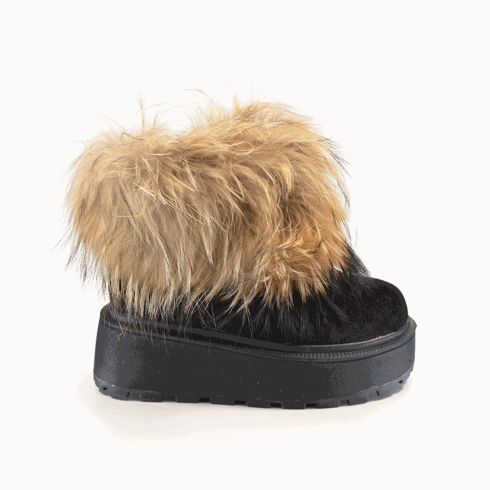 Ghete de iarnă din piele naturală. Talpa groasă, cu platformă de 4 cm în față și 5.5 cm în spate, oferă stabilitate și un plus de înălțime fără a compromite confortul. Designul modern, completat de detalii din blană, le face ușor de integrat în orice ținută casual de iarnă.