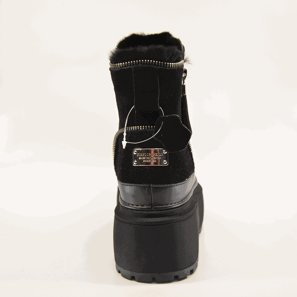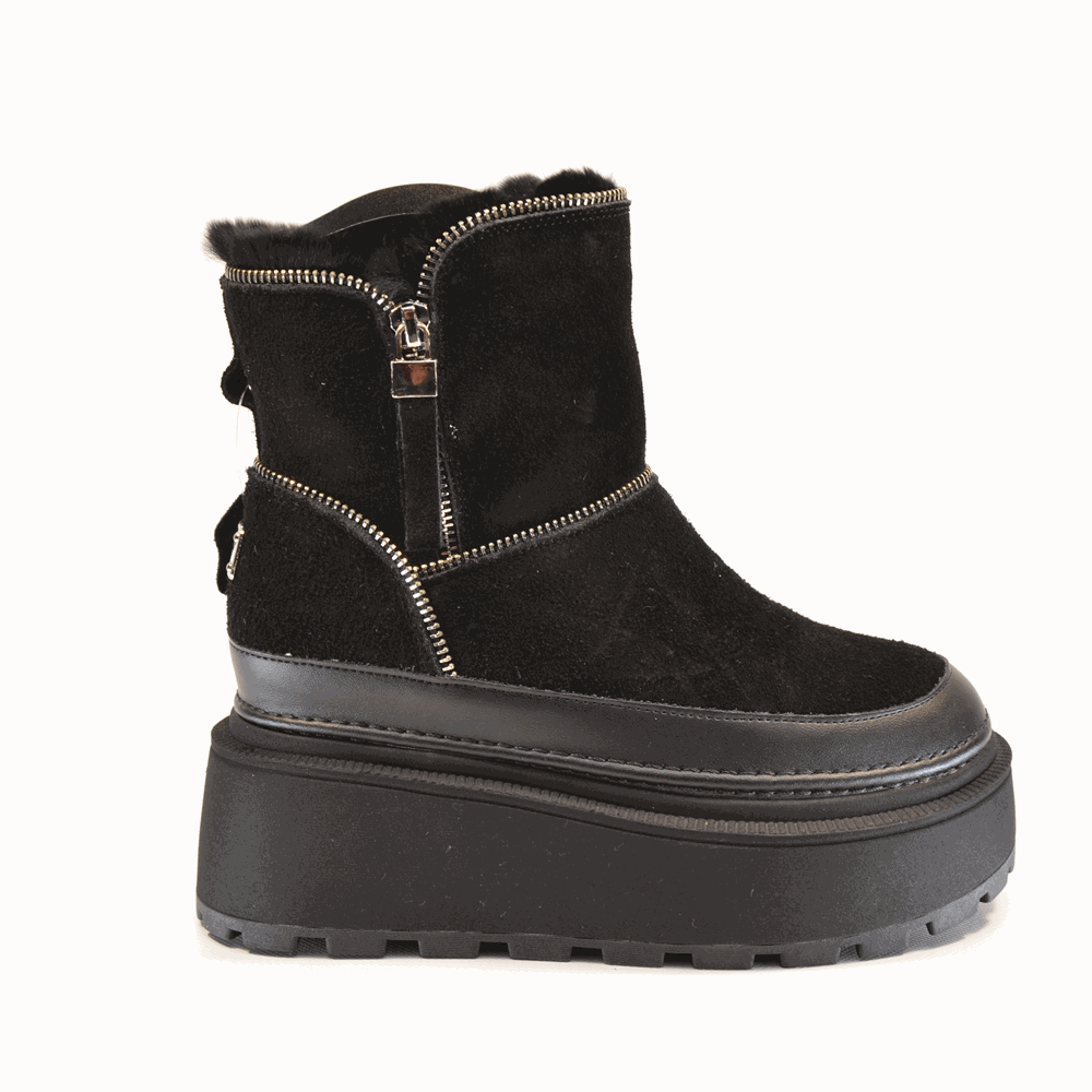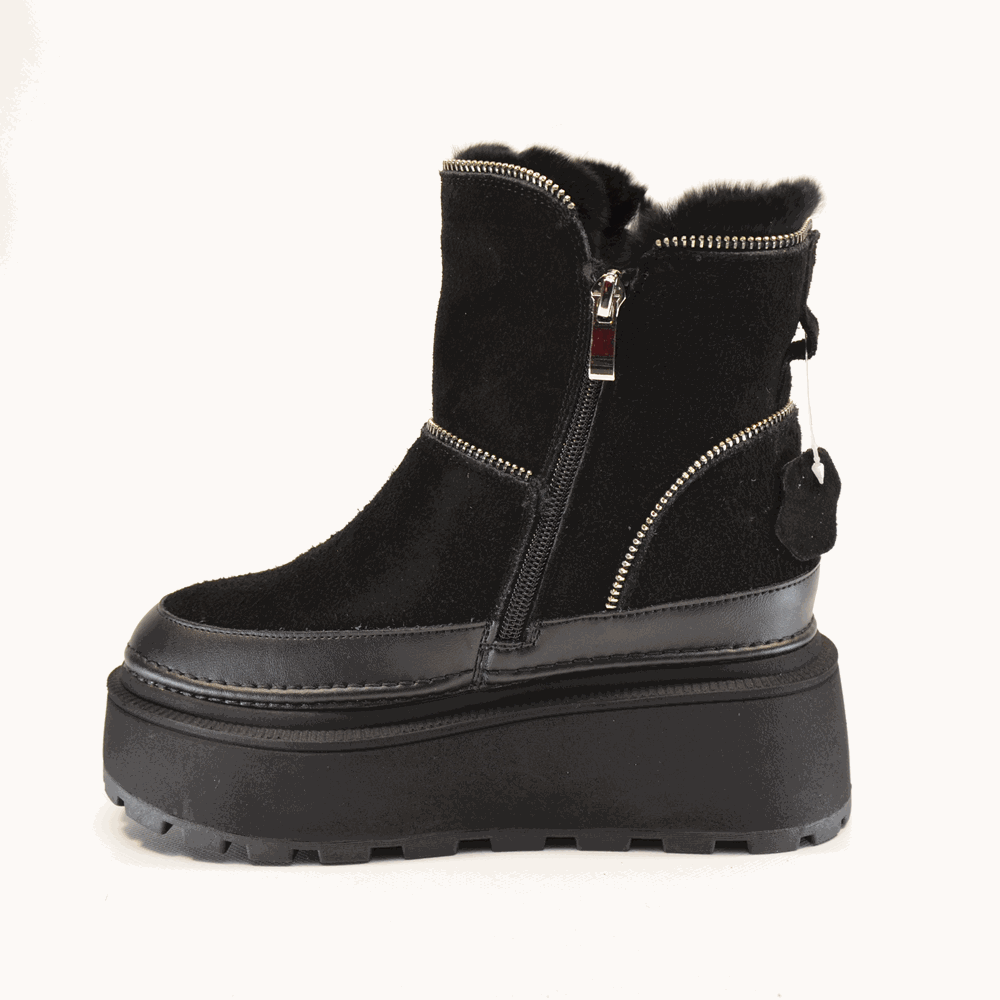 Ghete de iarnă din piele naturală. Talpa groasă oferă stabilitate și un plus de înălțime fără a compromite confortul. Designul modern, completat de detalii din blană, le face ușor de integrat în orice ținută casual de iarnă.