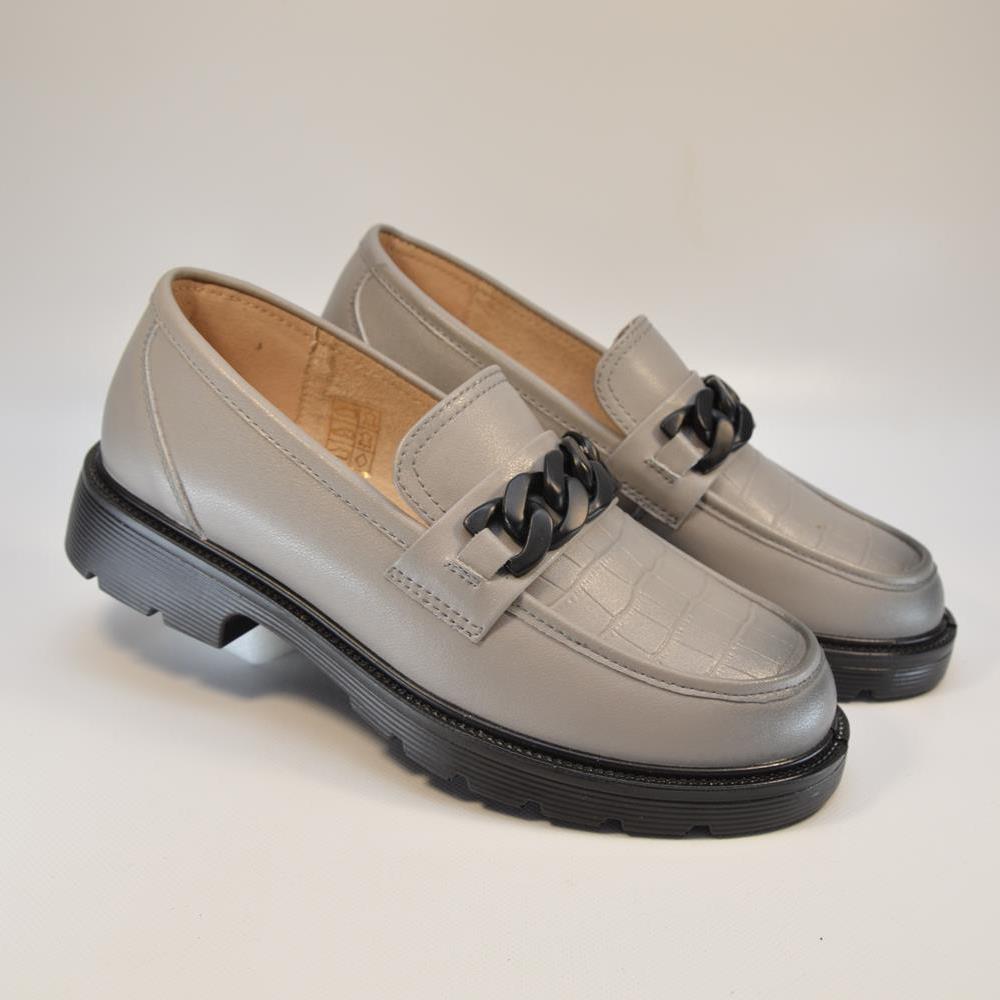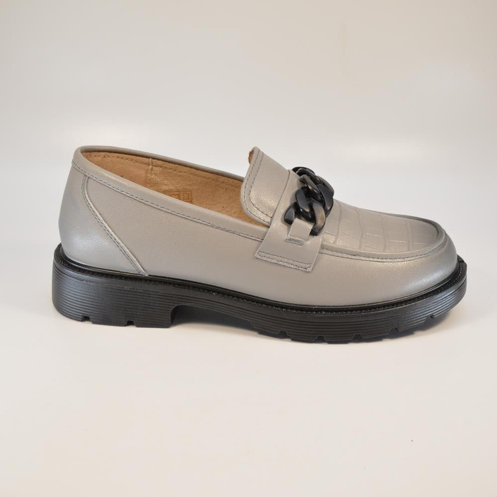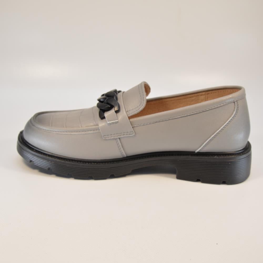 Loaferii de damă din piele naturală, atât la exterior, cât și la interior, se remarcă prin culoarea gri și lanțul decorativ, oferind un aspect elegant și versatil.