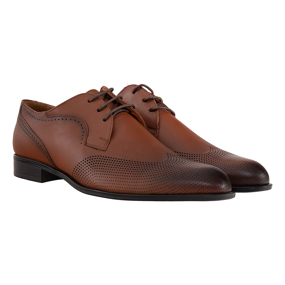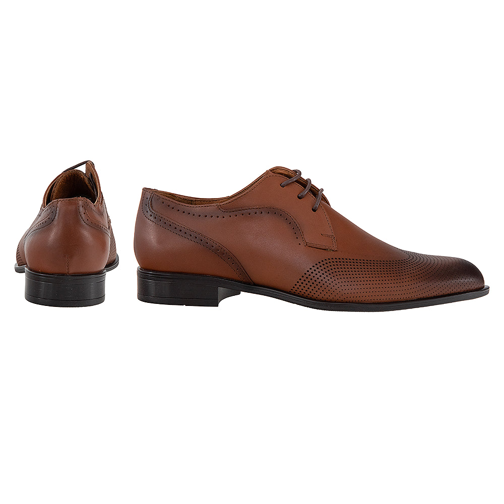 Acești pantofi bărbătești eleganți sunt realizați din piele naturală, cu un design rafinat accentuat de perforații decorative discrete. Forma clasică cu șireturi și finisajul atent lucrat îi transformă în alegerea perfectă pentru ocazii speciale. Sunt fabricați în România, oferind un echilibru între calitate, stil și confort.