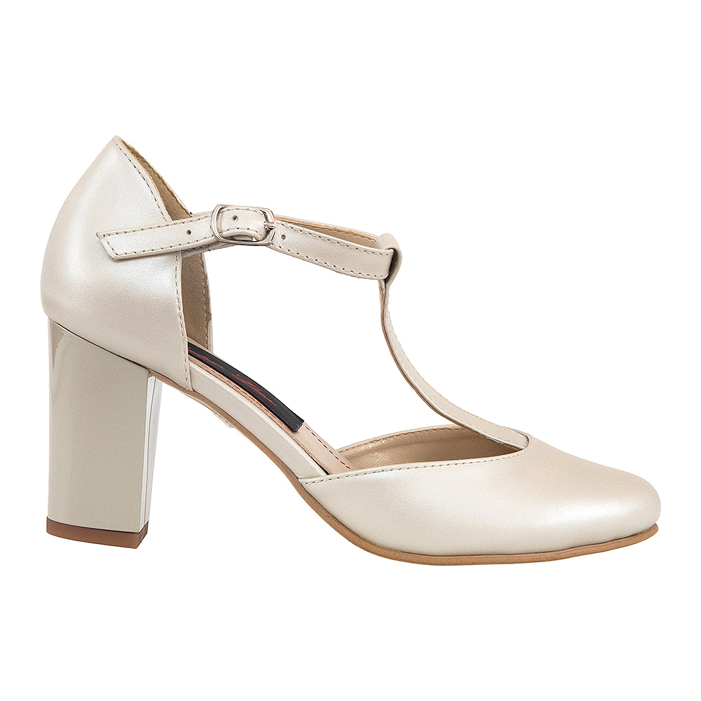 Pantofi bej cu toc, fabricați în România, cu design elegant T-strap și toc gros de 7 cm.