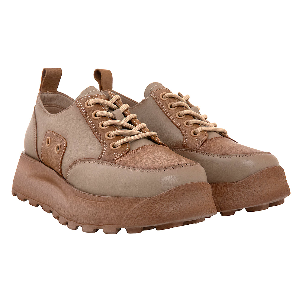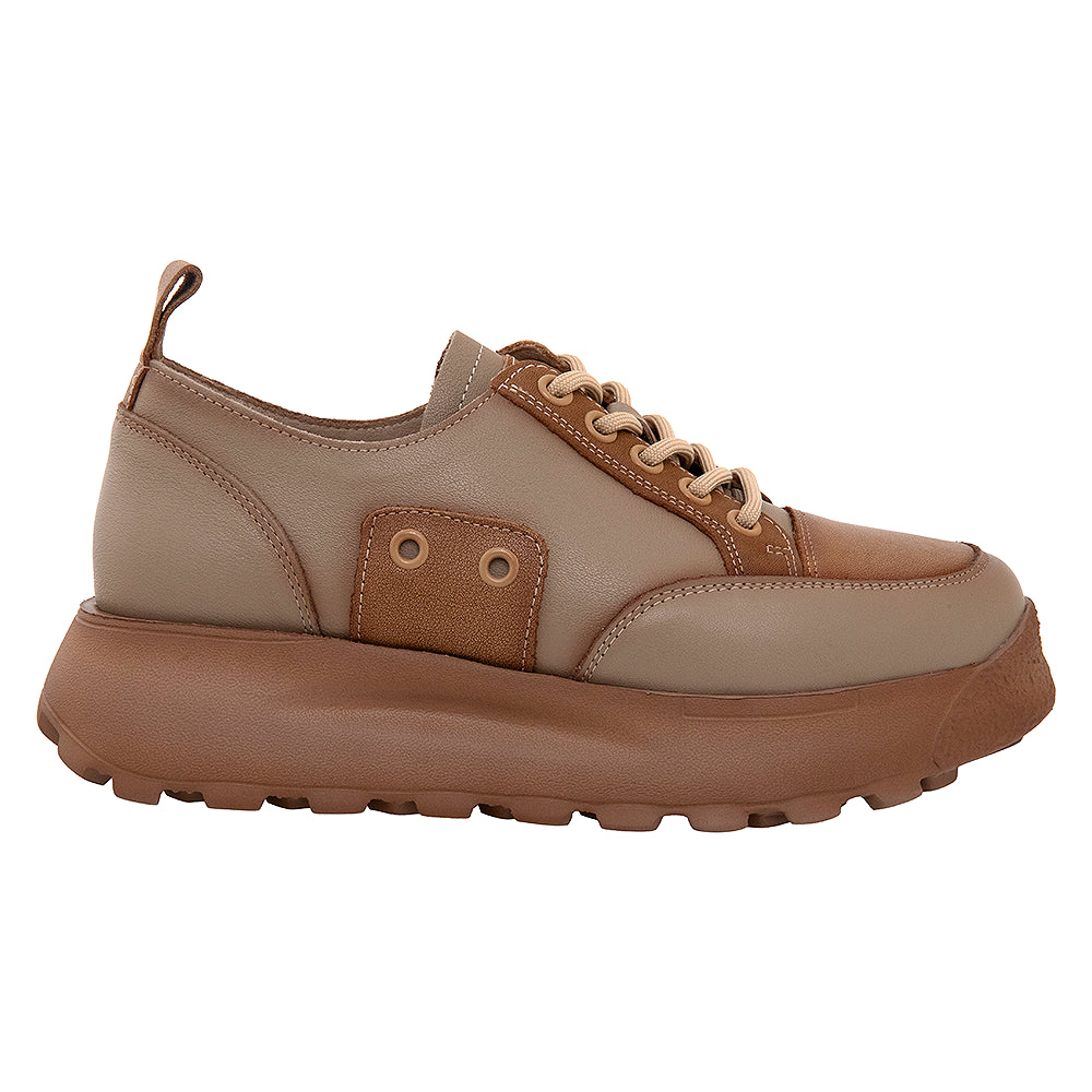 Încălțăminte sport din piele naturală nuanțată, cu zone contrastante maro și apricot, îmbinate armonios pentru un efect vizual dinamic.