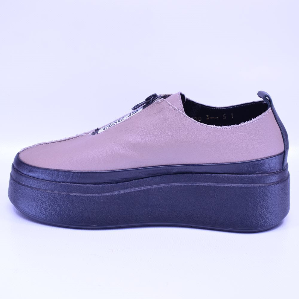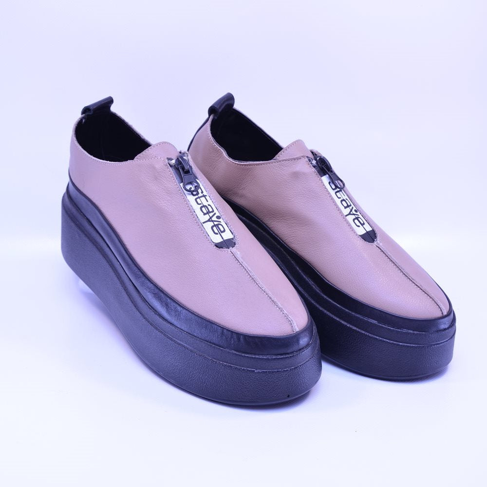Pantofi casual de damă fără șireturi, confecționați în România din piele naturală bej. Talpa neagră de 3 cm și branțul moale, cu design ergonomic, asigură confort optim și aderență excelentă.