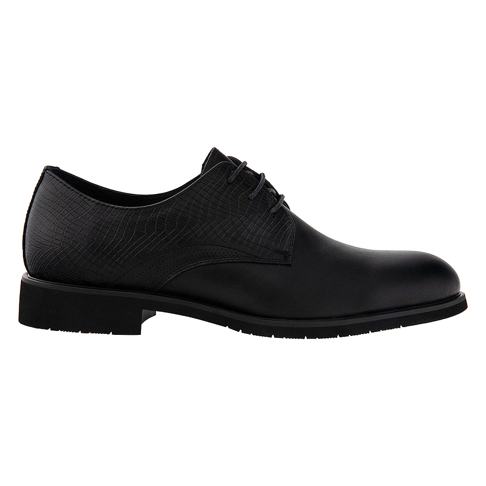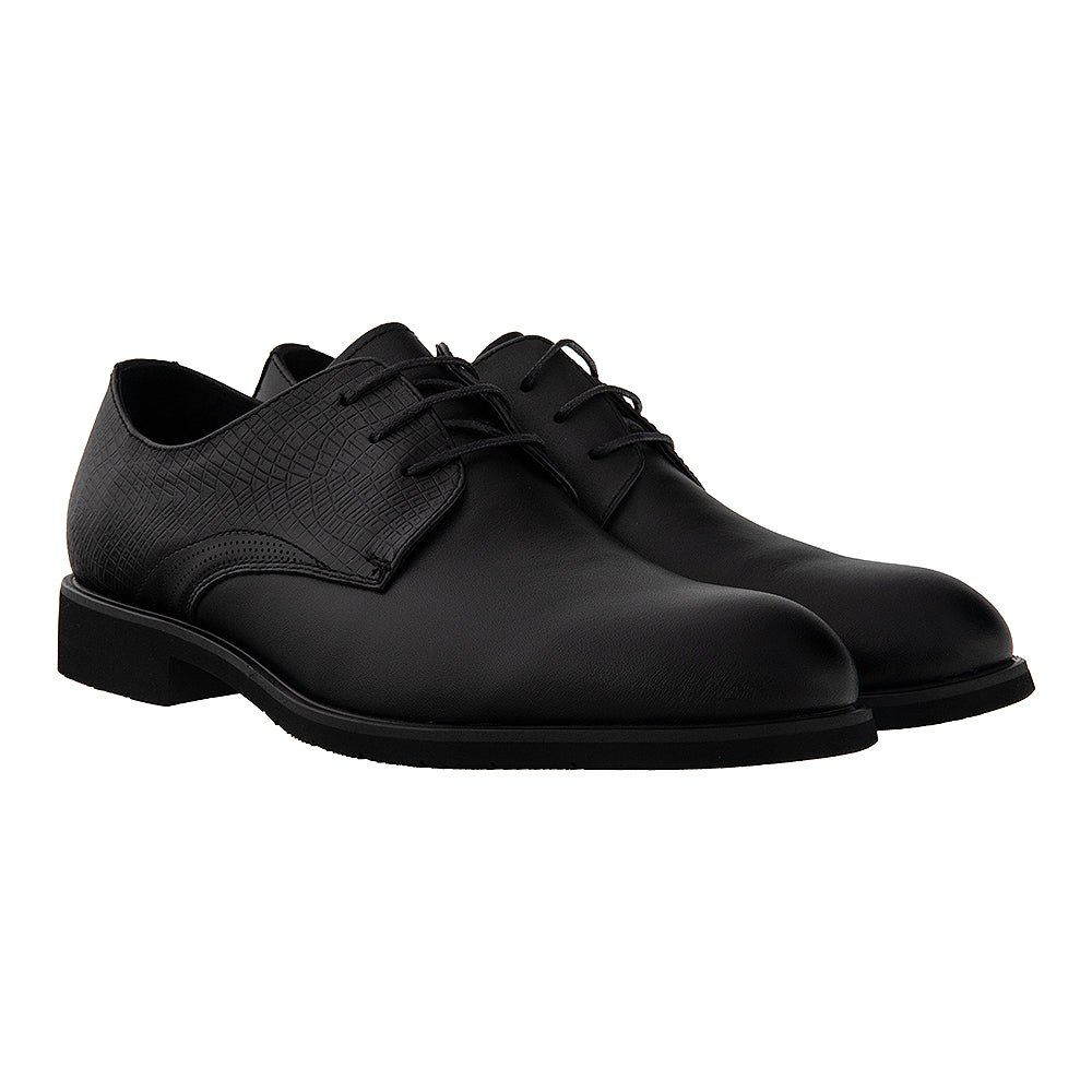 Pantofii Derby negri cu imprimeu confecționați din piele premium și se remarcă prin textura subtilă, adăugând un plus de originalitate și eleganță. Brantul moale și talpa flexibilă oferă confort pe durata întregii zile. Cu un design rafinat, sunt ideali pentru ținute office sau semi-formale.