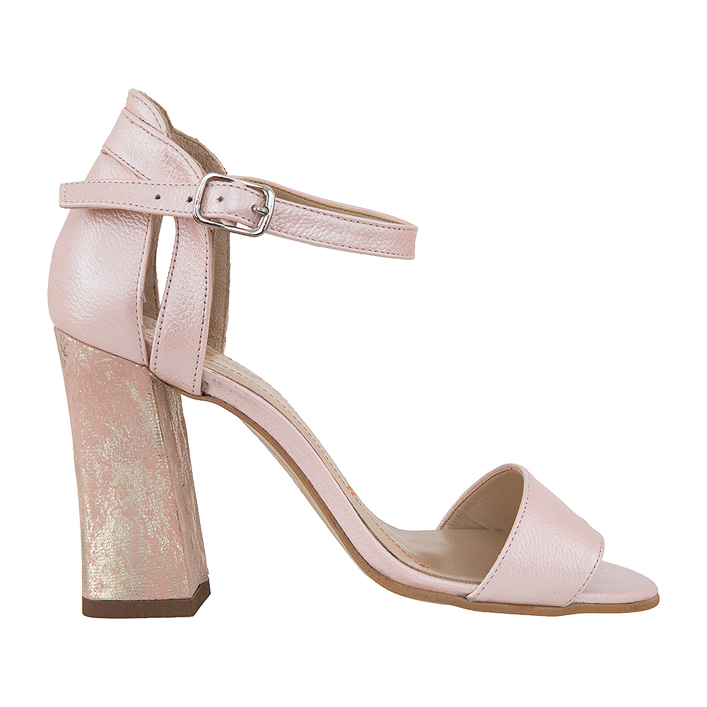 Aceste sandale cu toc gros sunt fabricate în România și îmbină strălucirea discretă cu un design elegant, ideal pentru ocazii speciale.