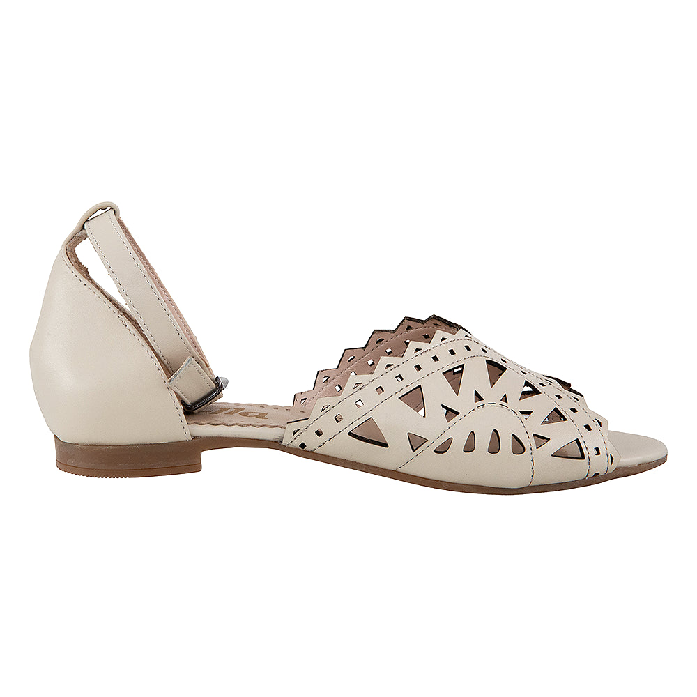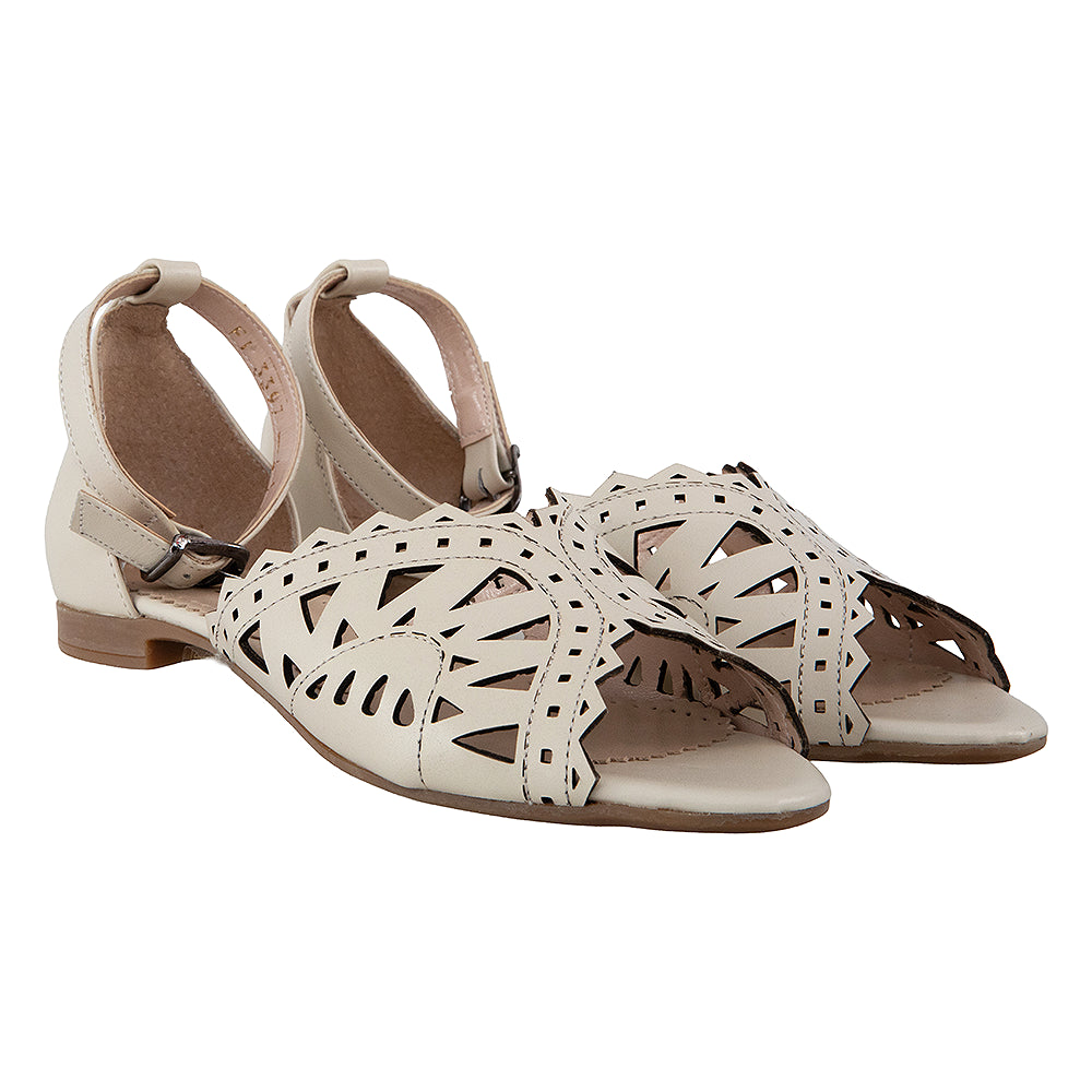 Sandale crem din piele naturală, fabricate în România, cu design decupat și perforații elegante. Talpă joasă, baretă reglabilă și confort sporit pentru purtare zilnică.