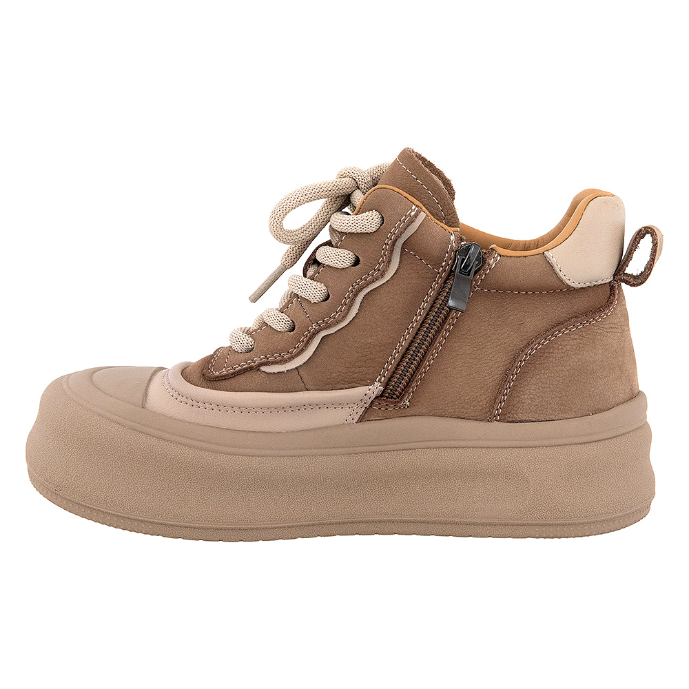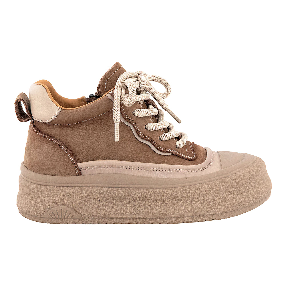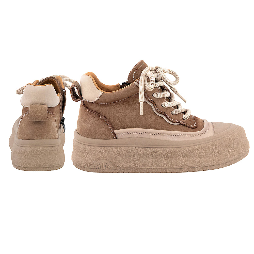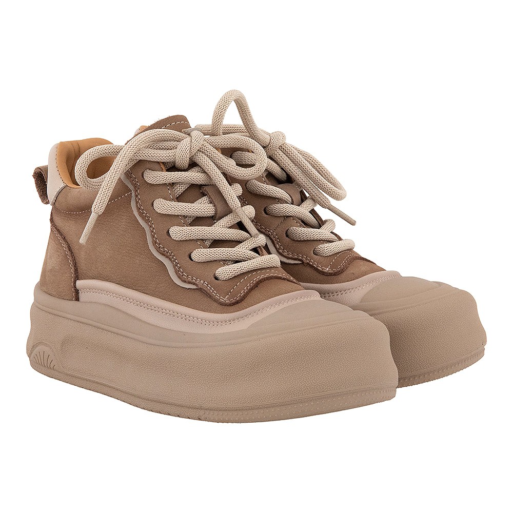 Acești tenisi bej combină pielea naturală cu materialul textil atât la exterior, cât și la interior. Talpa ușoară de 4 cm rămâne surprinzător de flexibilă.
